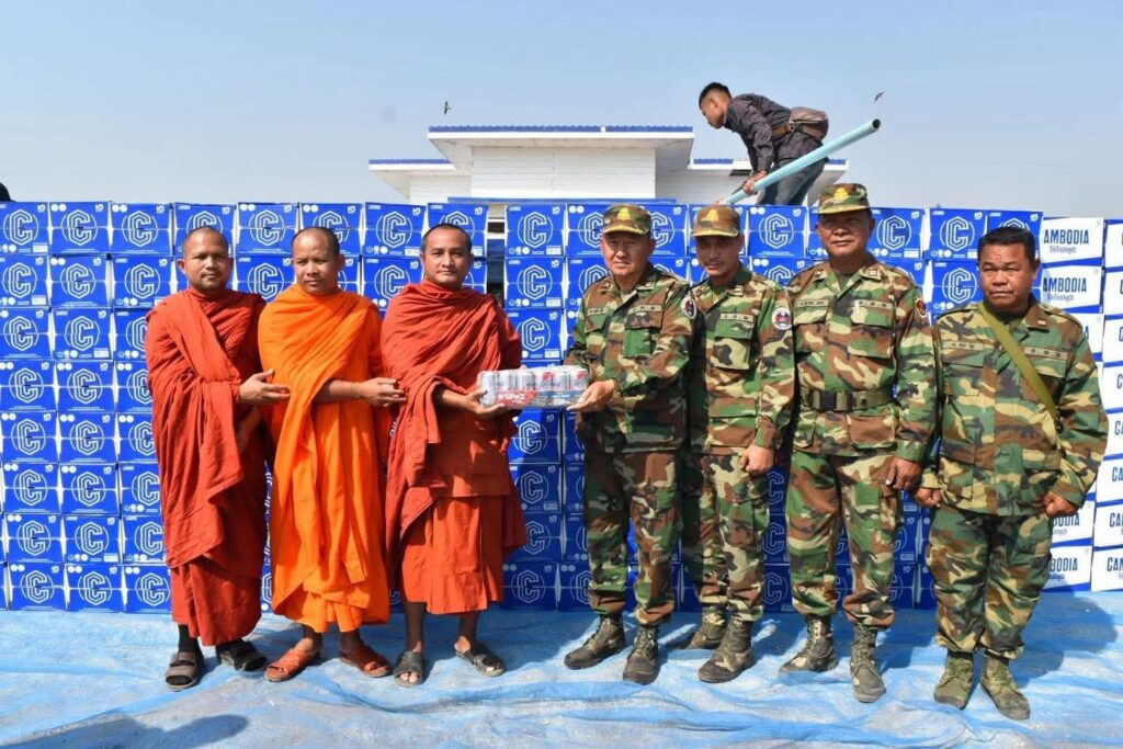 ឯកឧត្តម កែវ ផុង ជំនួយការផ្ទាល់សម្តេចតេជោ ហ៊ុន សែន ប្រធានព្រឹទ្ធសភា និងជាប្រធានក្រុមសេនាតេជោសន្តិភាព និងឯកឧត្តម ព្រហ្ម ប៊ុនឡុង ជំនួយការសម្តេចតេជោ ហ៊ុន សែន និង ជាអនុប្រធានក្រុមសេនាតេជោសន្តិភាព នាព្រឹកថ្ងៃទី២១ ខែកុម្ភៈ ឆ្នាំ២០២៦នេះ បាននាំយកទឹកបរិសុទ្ធកម្ពុជា ចំនួន ១ ០០០កេស ជូនដល់វីរកងទ័ព និងវីរនគបាលជាតិ កំពុងឈរជើងនៅជួរមុខប្រចាំនៅទិសខេត្តបន្ទាយមានជ័យ។ ក្នុងឱកាសនោះឯកឧត្តម កែវ ផុង និងឯកឧត្តម ព្រហ្ម ប៊ុនឡុង បានពាំនាំនូវការផ្តាំផ្ញើសាកសួរសុខទុក្ខពីសំណាក់សម្តេចតេជោ ហ៊ុន សែន, សម្តេចកិត្តិព្រឹទ្ធបណ្ឌិត ប៊ុន រ៉ានី ហ៊ុនសែន ប្រធានកាកបាទក្រហមកម្ពុជា, សម្តេចបវរធិបតី ហ៊ុន ម៉ាណែត នាយករដ្ឋមន្ត្រីនៃកម្ពុជា និងលោកជំទាវបណ្ឌិត ពេជ ចន្ទមុន្នី ហ៊ុនម៉ាណែត ដែលលោកតែងតែគិតគូរជានិច្ចពីសុខទុក្ខរបស់វីរកងទ័ព និងវីរនគរបាលទាំងអស់ កំពុងឈរជើងជួរមុខ។ ក្រុមប្រតិភូ បានសម្តែងការគោរពដឹងគុណការកោតសរសើរ និង វាយតម្លៃខ្ពស់ចំពោះវីរកងទ័ពនូវវីរភាព និងការលះបង់គ្រប់បែបយ៉ាង ដើម្បីការពារអធិបតេយ្យ និងបូរណភាពទឹកដីនៃកម្ពុជា ពីការរំលោភឈ្លានពានរបស់កងទ័ពថៃ នៅតាមបណ្តោយព្រំដែនកម្ពុជា-ថៃ។ថ្នាក់ដឹកនាំប្រតិភូ ក៏បានគោរពជូនពរឱ្យវីរកងទ័ព និងវីរនគរបាលទាំងអស់ មានសុខភាពល្អ កម្លាំងមាំមួន ដើម្បីបន្តបេសកកម្មការពារប្រទេសជាតិរបស់យើង។ តបនិងប្រតិភូចុះសួរសុខទុកដល់ជួរមុខ កងកំលាំងជួរមុខយើង បានថ្លែងគោរពអរគុណដល់ថ្នាក់ដឹកនាំតែងតែគិតគូរដល់ជួរមុខគ្រប់វេលា និង ថ្លែងគោរពអរគុណដល់ក្រុមប្រតិភូថ្ងៃនេះ ក៍ដូចជាថ្លែងអរគុណដល់សប្បុរសជននានាកន្លងមក តែងតែគាំទ្រសមរភូមិមុខក្នងស្មារតីខ្មែរជួយខ្មែរ ខ្មែរតែមួយ ហើយប្តេជ្ញាដាច់ខាតការពារបូរណភាពទឹកដី ពិសេសគោរពតាមបទបញ្ជាររបស់ថ្នាក់ដឹកនាំគ្រប់វេលា ៕